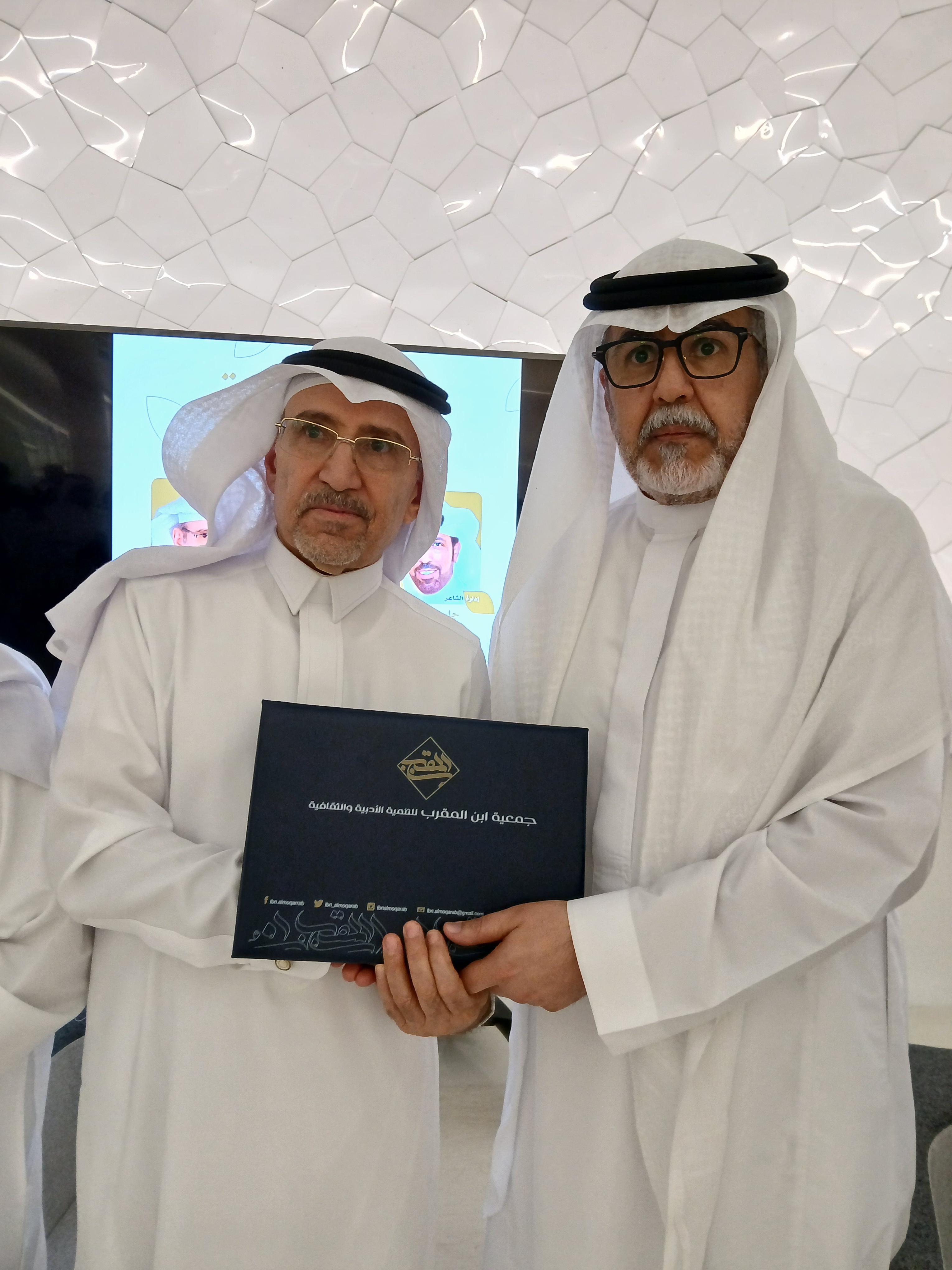 وفي ختام الأمسية قام الرئيس التنفيذي لجميعة ابن المقرب الأستاذ أحمد اللويم ،، بتكريم الشاعرين ومقدم الأمسية، والتقطت الصور التذكارية بهذه التظاهرة الثقافية الجميلة.
