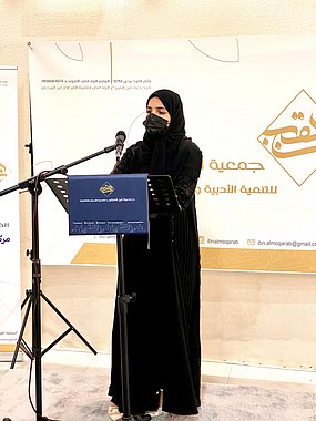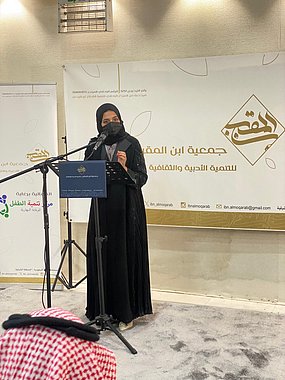 وفي الضفة الأخرى كانت مشاركات الأستاذة تهاني الصبيح، والتي اتسمت نصوصها بالجزالة والتنوع في مختلف الموضوعات الإنسانية والتأملية والوجدانية، فكان من نصوصها: من خولة إلى طرفة بن العبد، ذات اقتراب، نخلة من هجر، نص في النبي محمد (ص)، يا عيدها، وغيرها من النصوص الجميلة التي تفاعل معها الجمهور استحسانا وتصفيقًا.