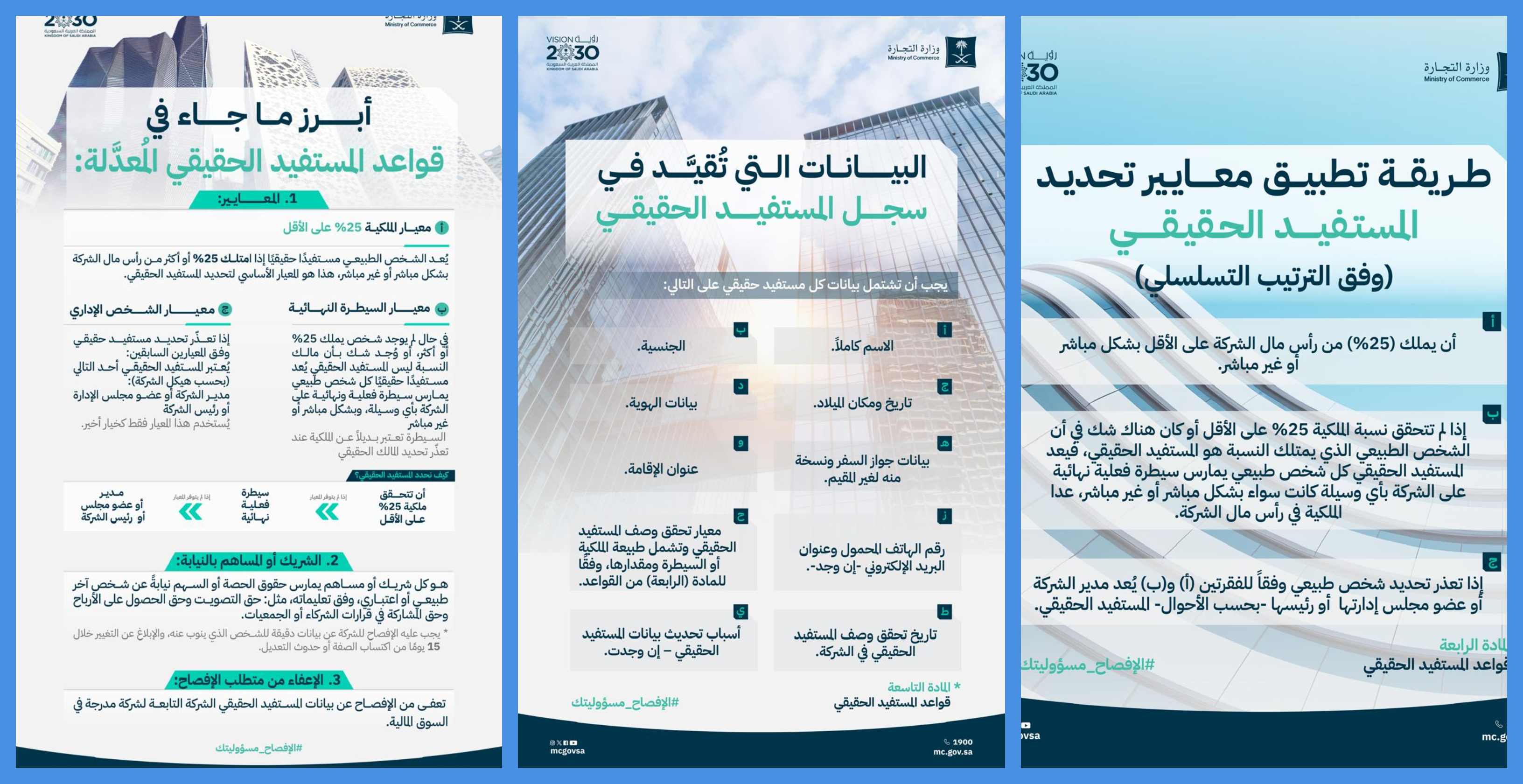 صدر قرار معالي وزير التجارة الدكتور ماجد بن عبدالله القصبي رقم (99) وتاريخ 1447/06/05هـ، بالموافقة على قواعد المستفيد الحقيقي، وعرّفت القواعد المستفيد الحقيقي بأنه الشخص -أو الأشخاص ذوو الصفة الطبيعية- الذي يمتلك سيطرة فعلية نهائية مباشرة أو غير مباشرة على الشركة.